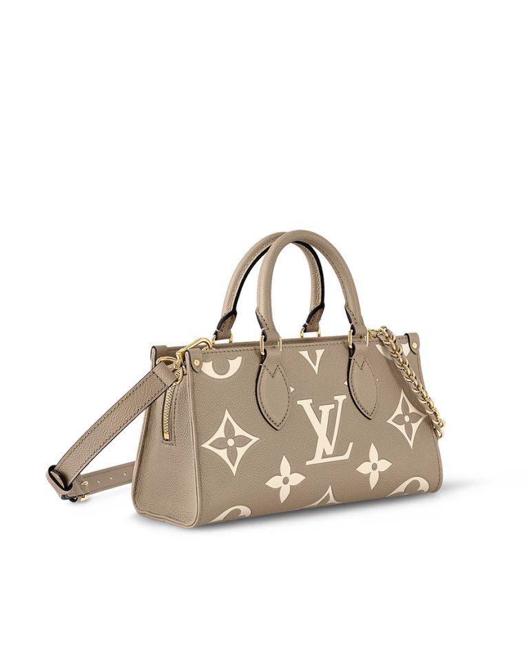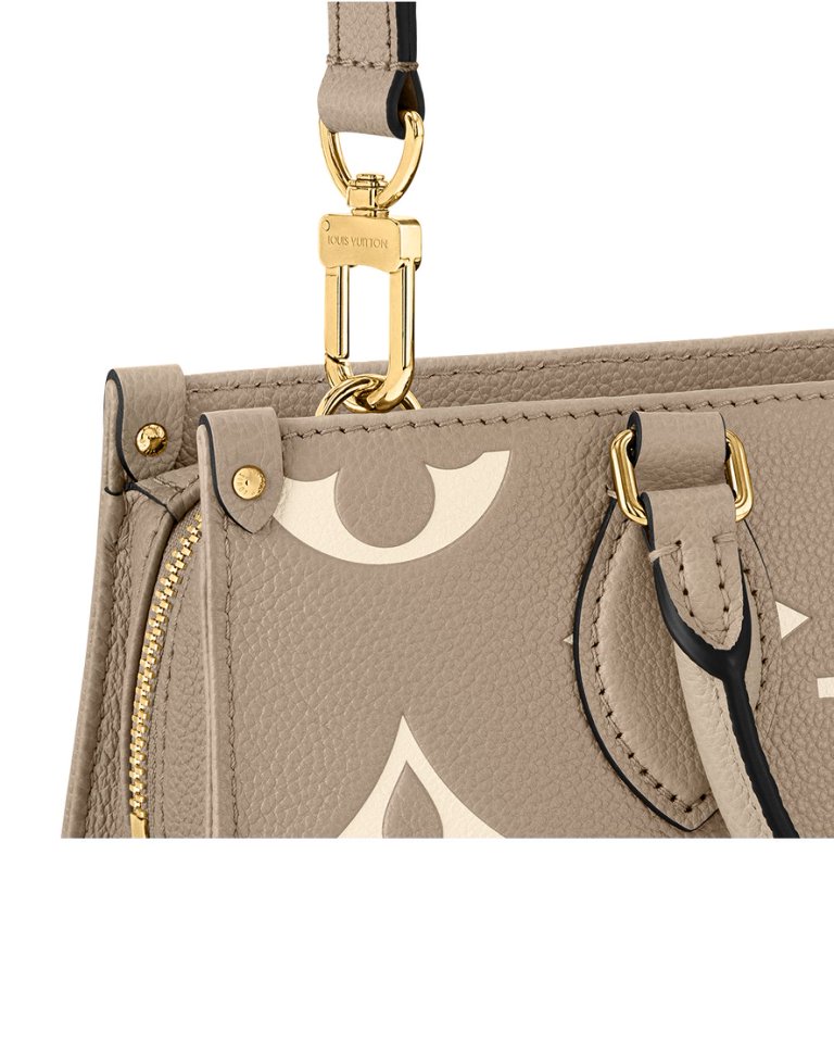 The Louis Vuitton OnTheGo Est Ouest Noir showcases a sophisticated blend of luxury and style. It features the iconic Monogram Empreinte leather with a bold Giant Monogram pattern embossed throughout, offering a modern twist on a classic design. The bag’s structure is both elegant and robust, with reinforced corners and edges that provide durability.